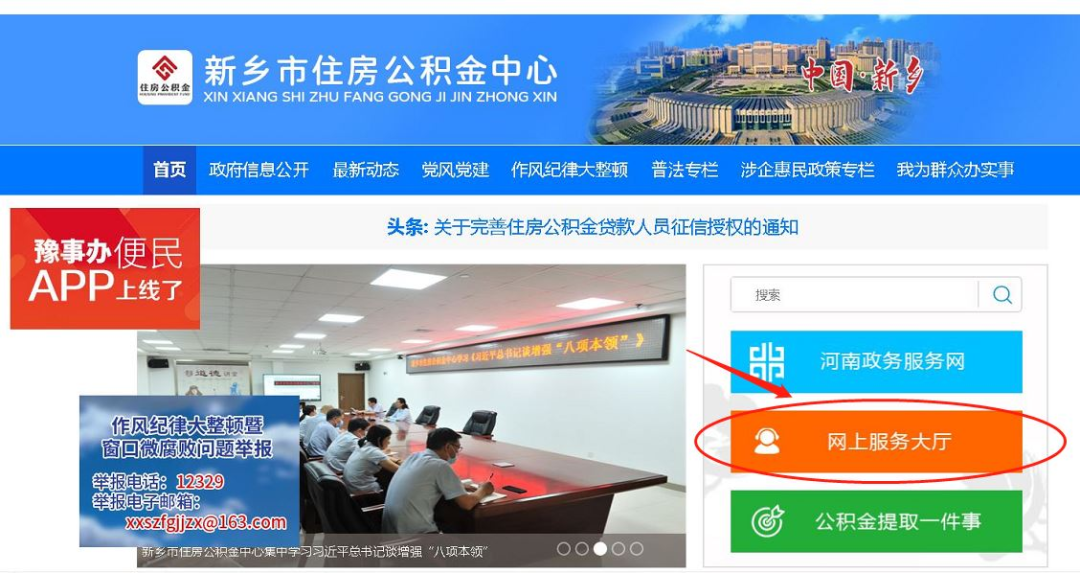 1.打开电脑浏览器,在地址栏输入新乡市住房公积金管理中心网址:http://www.xxzfgjj.com/,进入首页,点击“网上服务大厅”;